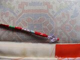 中綿を入れ、花柄の着物で作ったループを付け、ループの先に、トンボ玉と山サンゴを付けています
