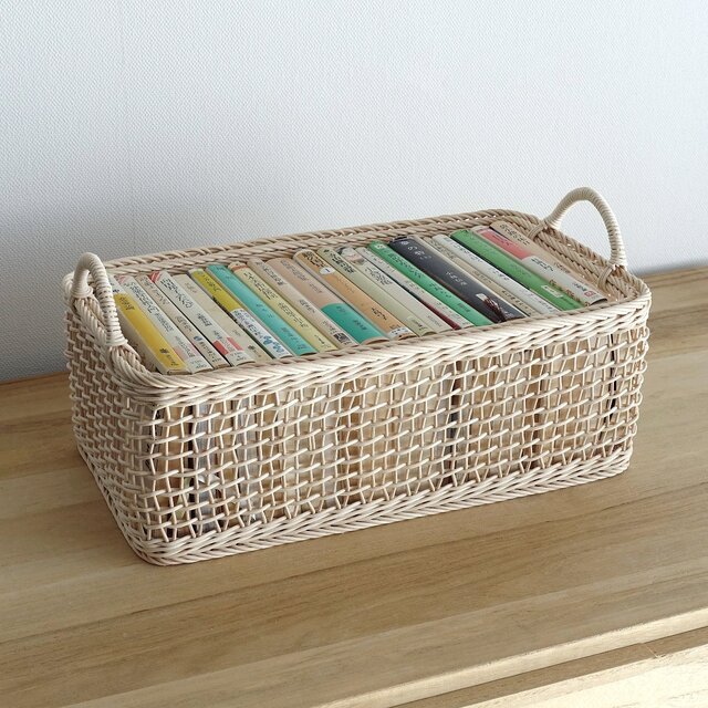 細い材で作っているので、写真のように本を入れた場合は持ち上げるとたわみます。持ち運び用というよりは、据え置き用としてお使いください。