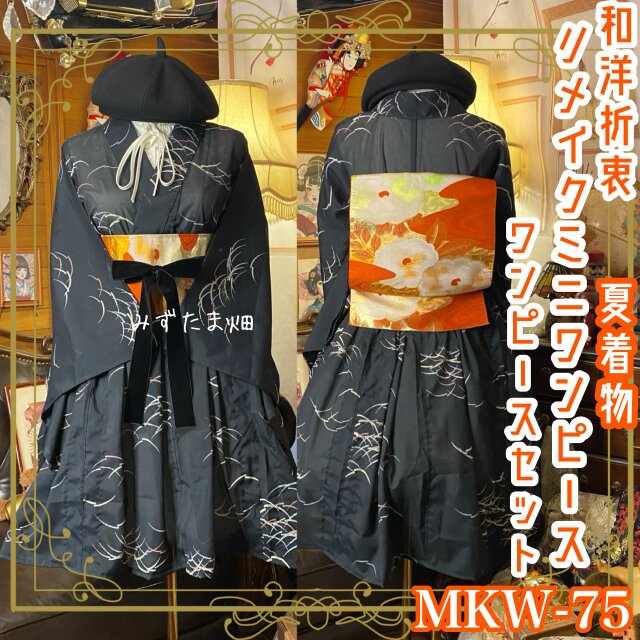 着夏物 ミニ丈 ワンピース ドレス 和ロリ 2部式作り帯 名古屋帯 お太鼓 リメイク 和洋折衷 単衣 フリーサイズ MKW-75