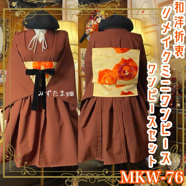 着物 ミニ丈 ワンピース ドレス 和ロリ 2部式作り帯 名古屋帯 お太鼓 リメイク 和洋折衷 洗える 化繊 単衣 MKW-76