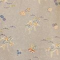 落ち着いたグレーブルーの地に、藤や紅葉といった四季の花々が情報の欠片のように配された、情緒豊かなワンピースです。都会の街角で、自立した美学を放つ一着に。