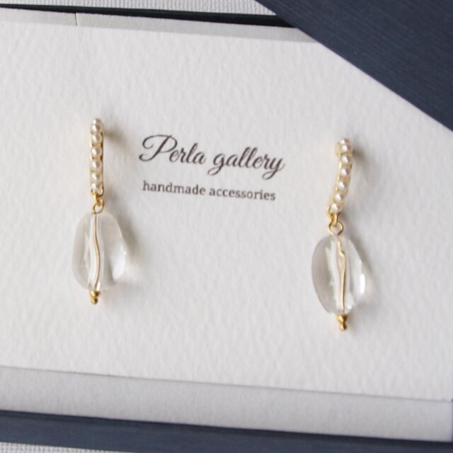 1点限定の水晶とパールが綺麗なピアスになります。
