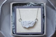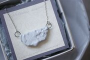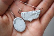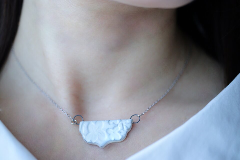 草花をモチーフに消しゴムはんこを彫り、はんこを陶土に捺しつけて凹凸の模様をつけたネックレスです。