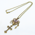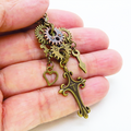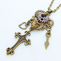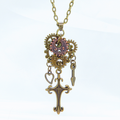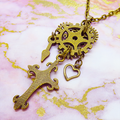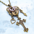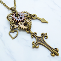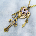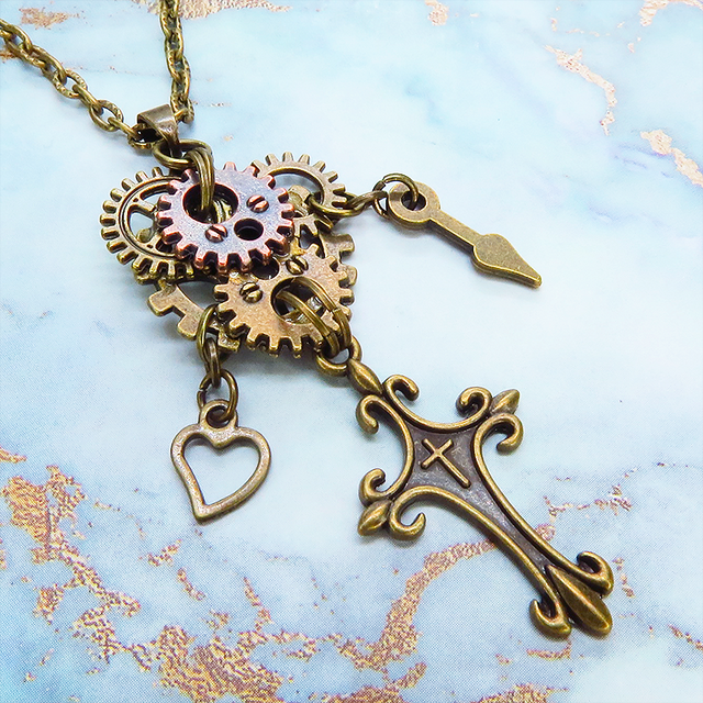 静かな祈りを象徴するようなロザリオと時を刻む歯車を巧みに組み合わせた、スチームパンク風の装飾が目を惹くペンダントです