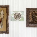 文字盤の装飾には木片とガラス玉などを使用してます。