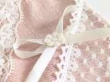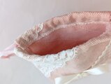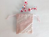 淡いピンクのデニム生地に、レースとリボンを飾った可愛らしいミニ巾着です。