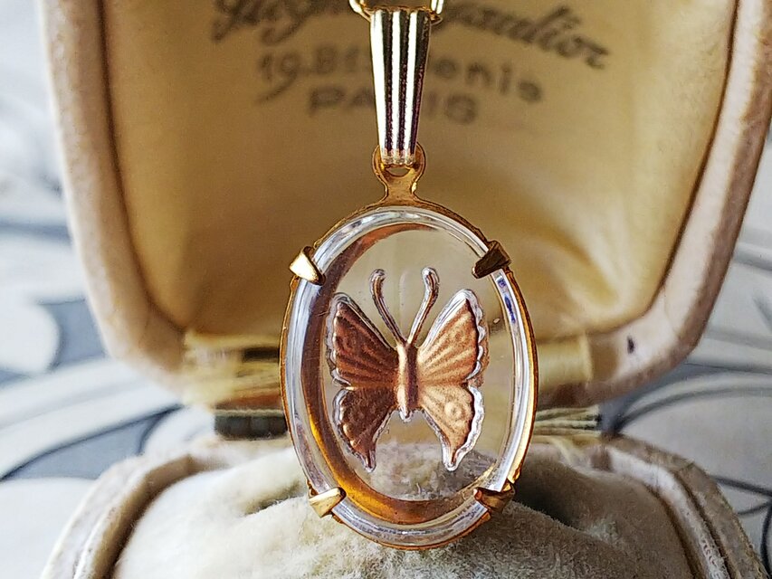 1960年代Germanヴィンテージ、約18×13mmの美しい蝶のGlassインタリオを用いてお作りしましたネックレスです。