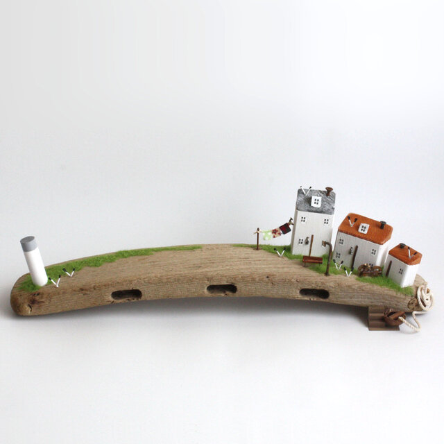 流木、ねじ・釘(赤錆加工)、ホワイトウッド(欧州スプルース、ドイツトウヒなど)、ステイン、ペンキ等で製作。ヤスリでダメージ感を演出しています。「潮騒とカモメの鳴き声、風の音」を感じていただければ幸いです。