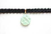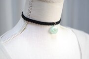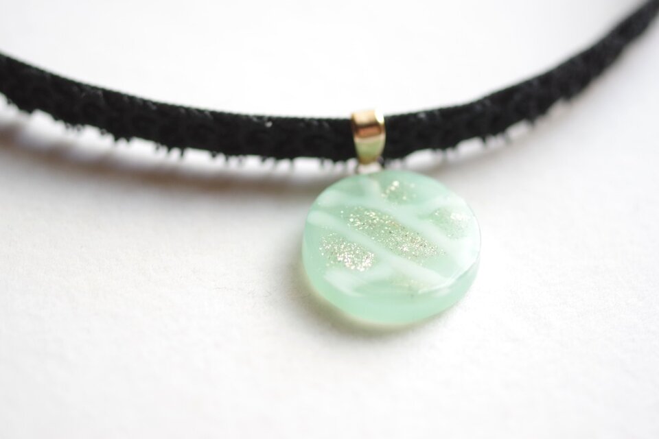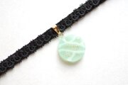 半透明のグリーンにラメを乗せ、水面のような模様を描いた、しっとりとした風情と爽やかさを併せ持ったレジンを、ベルベットリボンにタティングレースで装飾を施したチョーカーに仕上げました。