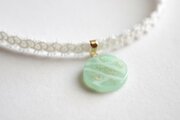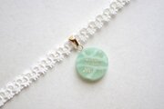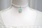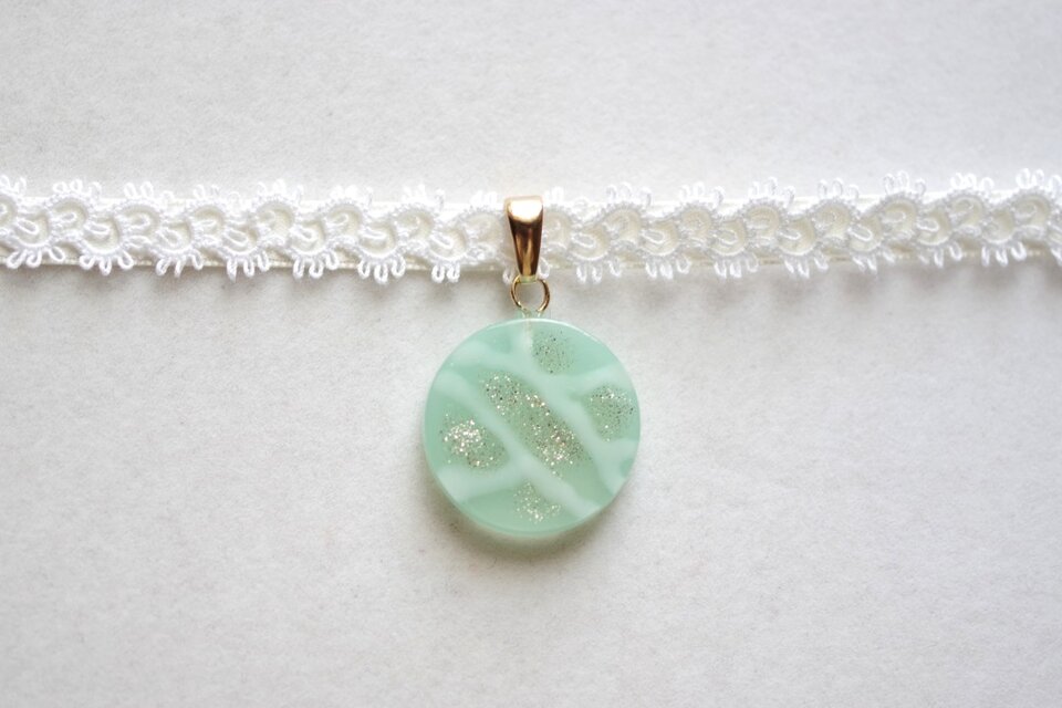 半透明のグリーンにラメを乗せ、水面のような模様を描いた、しっとりとした風情と爽やかさを併せ持ったレジンを、サテンリボンにタティングレースで装飾を施したチョーカーに仕上げました。