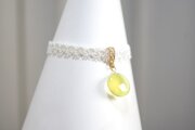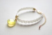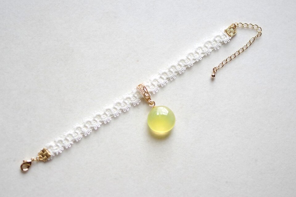 零れ落ちた一粒の水滴のようなレジンを、サテンリボンにタティングレースで装飾を施したブレスレットに仕上げました。