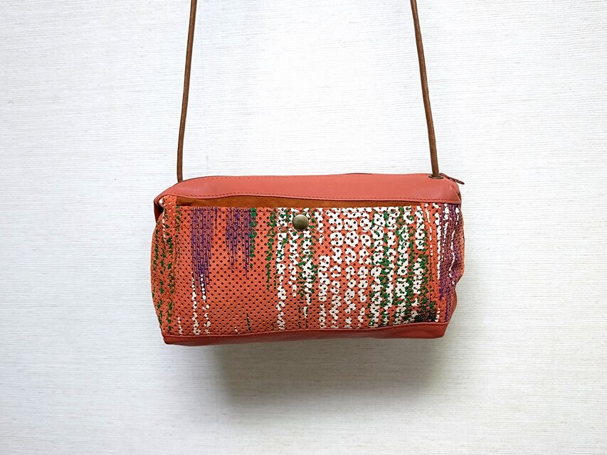 長財布や眼鏡ケース等を入れるのに丁度いいサイズの楕円形のポシェットです。