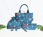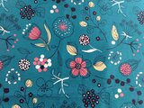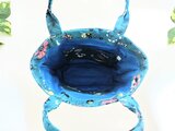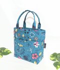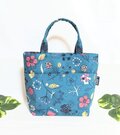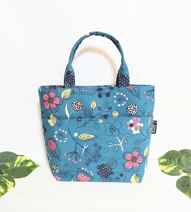 北欧の花柄、落ち着いたターコイズブルー色地にスモークピンク色の花柄綿オックス生地のお出掛けバックです。