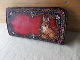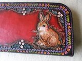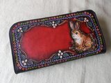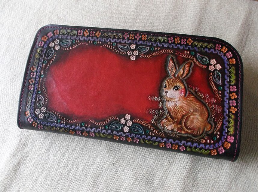ヌメ革を刻印やカッターでクラフトして拭き染めを施したロングウォレットです。