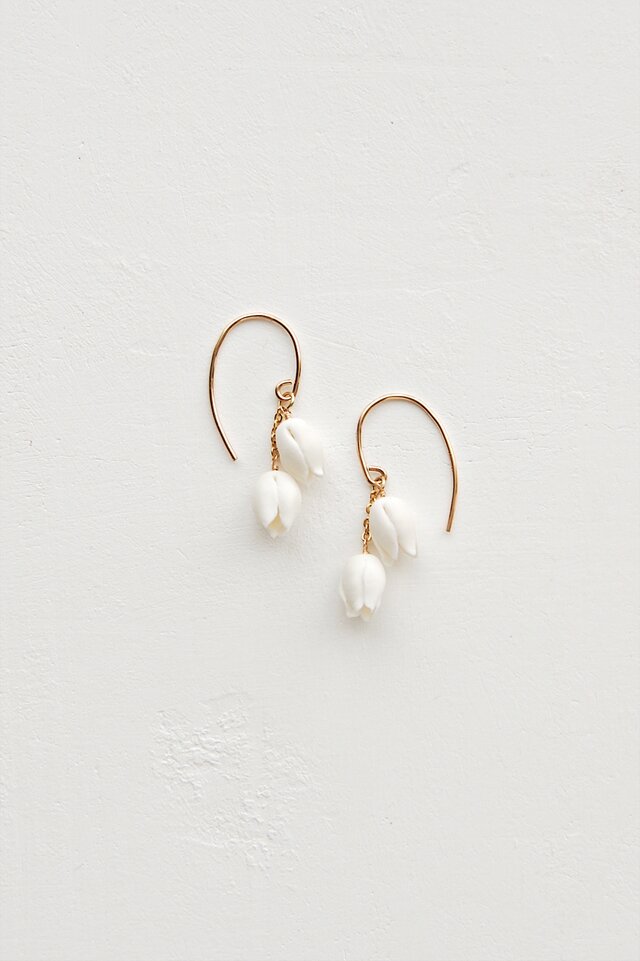 すずらんをモチーフにした耳飾り。あたたかみのある白いクレイでひとつずつ丁寧に、小さなつぼみを手作りしました。コロンとして愛らしいシンプルなデザインは、日々のコーディネートのちょっとしたアクセントにぴったりです。
