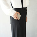 ホックを外してそのままタテに開く見開き構造。開いた瞬間にカード・小銭・お札が一望でき、同じ手のまま取り出し→支払い→収納が一直線。レジ前でもたつかない、時短のための動線設計です。