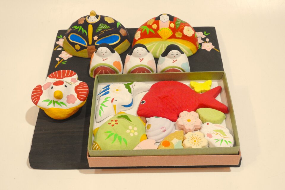 お菓子に見立てた飾りは粘土を素焼きしたものです