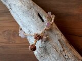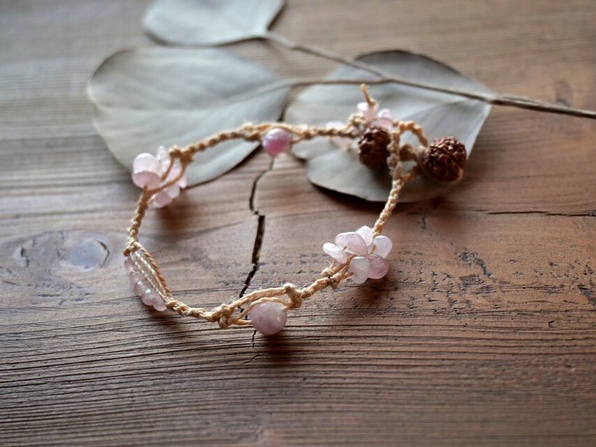 日本の麻の手紡ぎ糸と天然石ピンクトルマリン・ローズクォーツ、悟りの木といわれる菩提樹の実のブレスレットです。