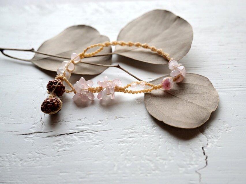 日本の麻の手紡ぎ糸と天然石ピンクトルマリン・ローズクォーツのブレスレットです。