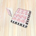 桜とピアノ(縦の鍵盤には桜模様をあしらいました)&音符がおりなすはんなり優しいデザインのiPad手帳型タブレットケースです。