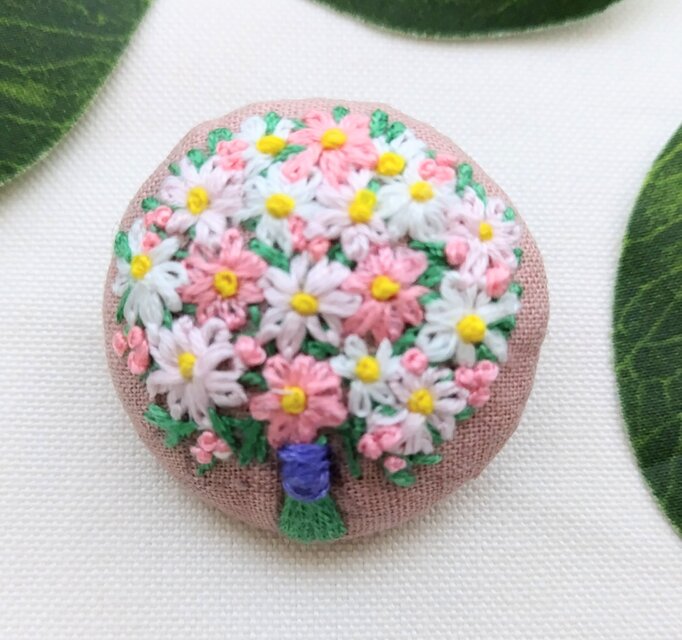 スモークピンク色綿リネン生地に優しい色合いのピンクの花束をモチーフにした刺繍ブローチです。