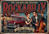 ロカビリー風のレトロアートで、ダンスと音楽の雰囲気を演出。