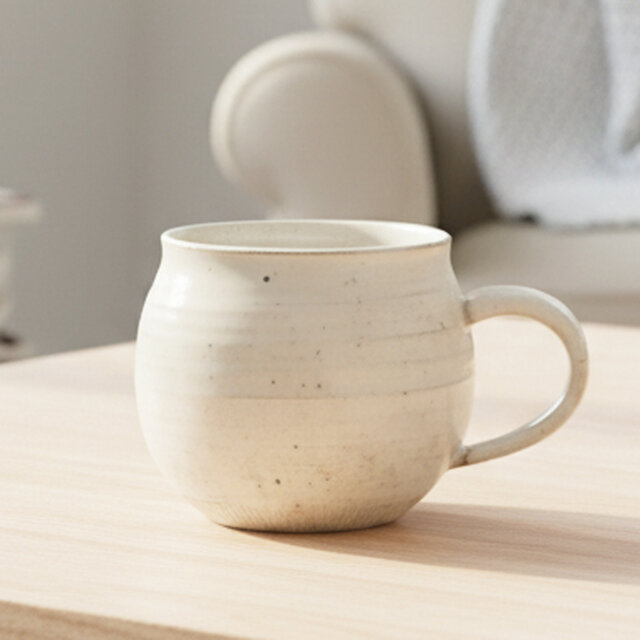 手にしっくりと馴染む丸みを帯びたフォルムと粉引ならではの柔らかなオフホワイトが、心解けるティータイムを演出します。