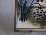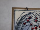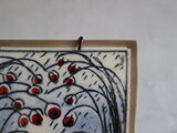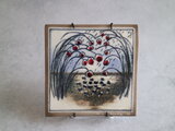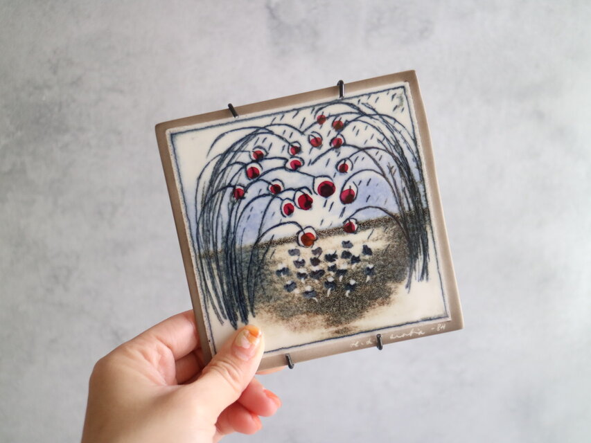 しなやかに垂れる枝と、艶やかな赤い実。静かな風景の中に、ぱっと目を引く赤が印象的な陶板です。