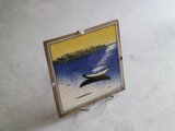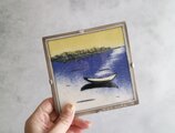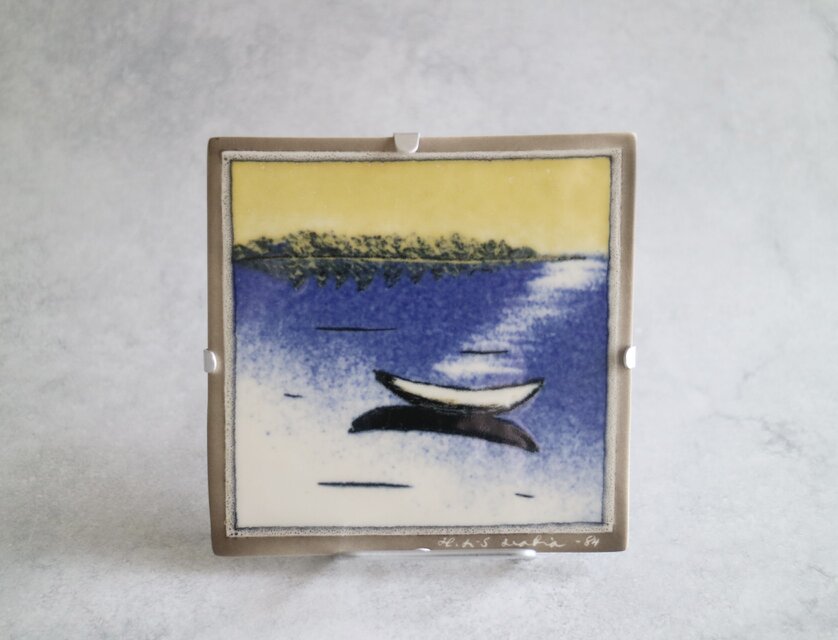 湖面に浮かぶ一艘の舟を描いた、ヘルヤらしい静かな風景陶板。