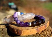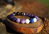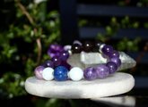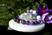 眠り石とも言われるセレスタイトを使用した、安眠、深い眠りのためのブレスレットです。古くは不眠症の治療に用いられたと言われるスモーキークォーツ、同じく不眠に効果があると言われるアメジスト、安眠や疲労回復の効果も期待でき、更年期や不眠で悩んでいる人に良いと言われているレピドライト、不眠とアレルギー、病気のストレスを軽減してくれるモスコバイト、不眠とめまいを和らげ、血圧を下げる働きもあると言われるラピスラズリを組ませました。