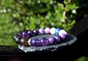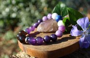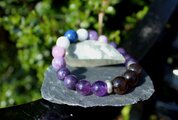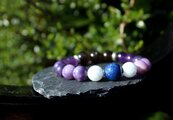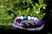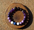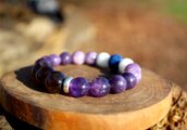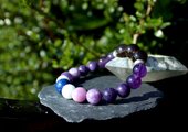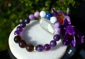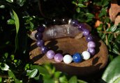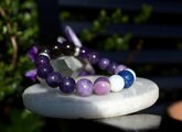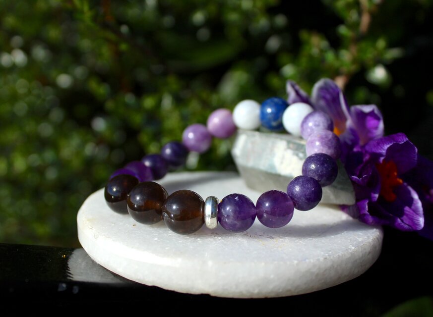 中心に12ミリのスモーキークォーツ、AAA級の10ミリアメジスト、10ミリのレピドライト、10ミリのモスコバイト、10ミリのセレスタイト、最後に12ミリのラピスラズリを組ませました。
