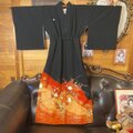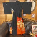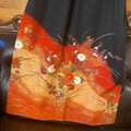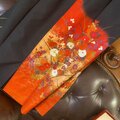 黒留袖を、贅沢にリメイクした一着です。漆黒の地に映える金彩や鮮やかな刺繍は、まさに情報の純度が高い芸術品そのもの。