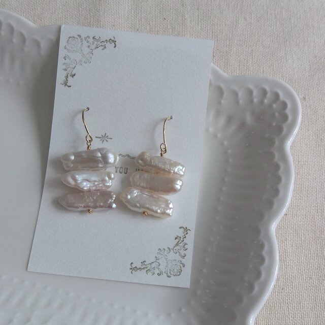 【希少】14kgf いびつな方が美しさを引き立てる3連淡水ビワパールのピアス