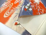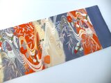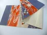 ■新品の帯をリメイクしました。青赤キナリのグラデーション地に流水に水車が見られ笹や菊などの小花と飛ぶ鳥の華やかな文様です。