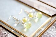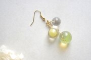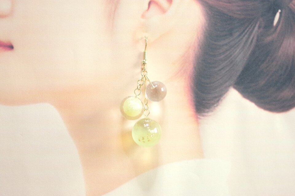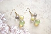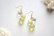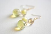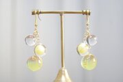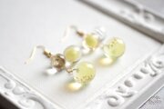 一つは小さなクリアーな粒、二つ目は光沢のある明るいイエローに控えめに金色のラメをちりばめた中くらいの粒、そして三つめはやはり明るい黄色とクリアーがグラデーションになった大きい粒。この三つが耳元で揺れる様子が軽やかで愛らしいピアスです。