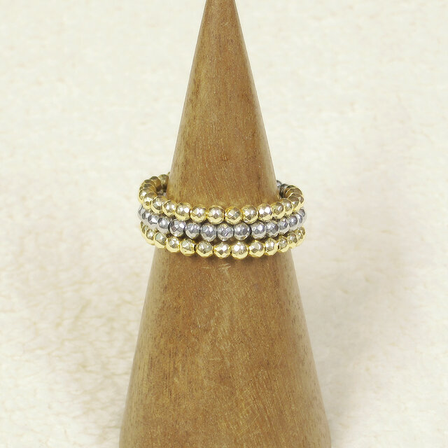きらきらと細かに輝く多面カットのヘマタイト(ゴールド色とシルバー色の2色メッキ)の3連リングです。