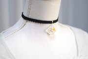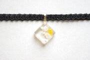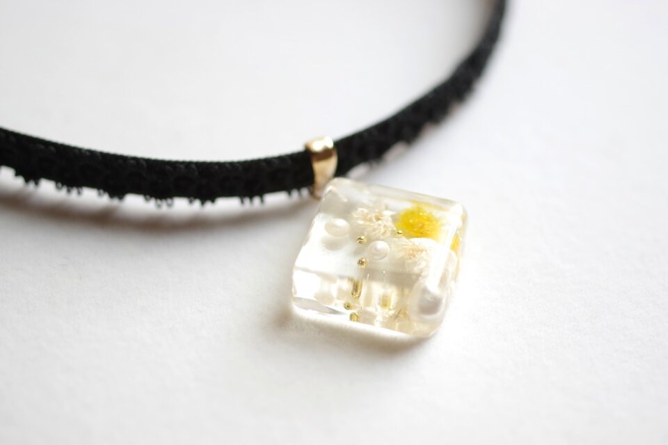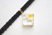 黄色とオフホワイトのお花、パール、ブリオンを沈めた四角いレジンを、ベルベットリボンにタティングレースで装飾を施したチョーカーに仕上げました。