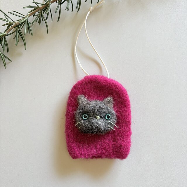 生地は、約2倍の大きさにメりノ毛糸を編んで縮絨させて(フェルト化)して仕上げました。