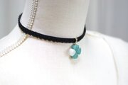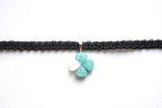 爽やかな光沢のあるモスグリーンと真珠色の組み合わせが可憐なクローバーモチーフのレジンを、ベルベットリボンにタティングレースで装飾を施したチョーカーに仕上げました。