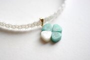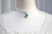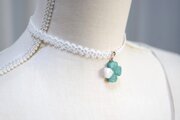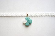 爽やかな光沢のあるモスグリーンと真珠色の組み合わせが可憐なクローバーモチーフのレジンを、サテンリボンにタティングレースで装飾を施したチョーカーに仕上げました。