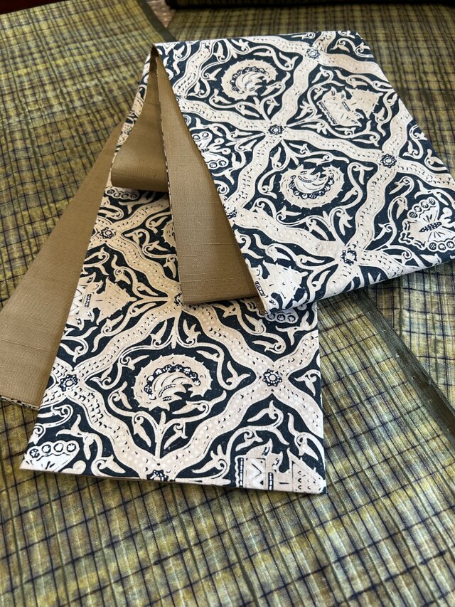 インドネシアバティック綿古布と反対側は絹紬無地を合わせて半幅帯を作りました。