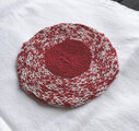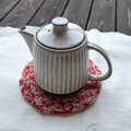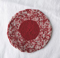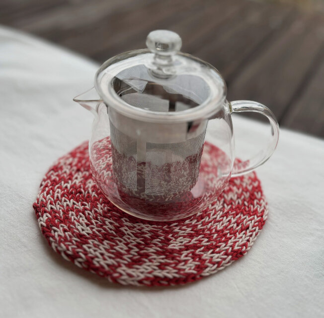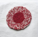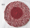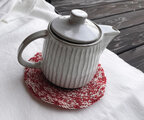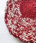 赤とアイボリーのコットン毛糸を2本引き合わせて、かぎ針編みで引き抜き編みをした、一点物のポットマットです
