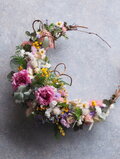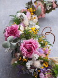春らしい色合いの小花を、空気を含ませながら ふんわりと紡ぎ、風に吹かれたように動きのあるアオツヅラフジのツルをあしらい、春風が通り抜けたかのような軽やかな立体感を表現しました。