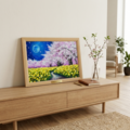 特に注目すべきは、油彩独特の重厚な質感によって表現された花々の立体感です。月光を浴びて浮かび上がる菜の花は、大地から湧き上がる光のように鮮やかに描かれ、その色彩は鮮烈なイエロー、深みのあるブルー、そして淡いピンクが織りなす春の極致を醸し出しています。対照的に、夜空に浮かぶ青い満月は透明感のあるタッチで描かれ、静かな夜の奥行きを演出しています。