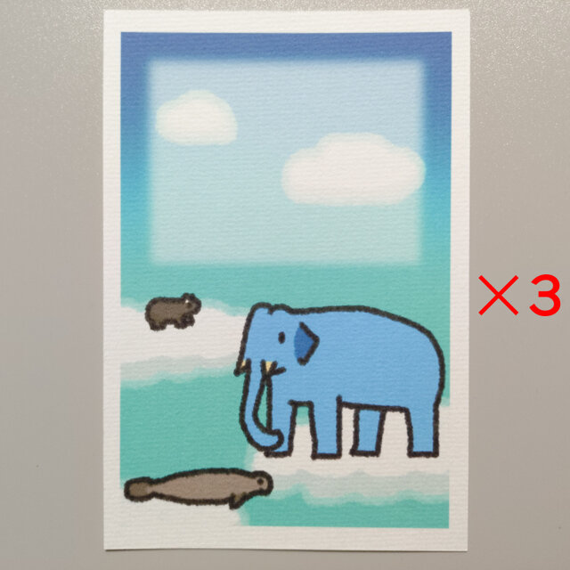 手書き調の動物と雲空をデザインした絵はがきです。