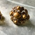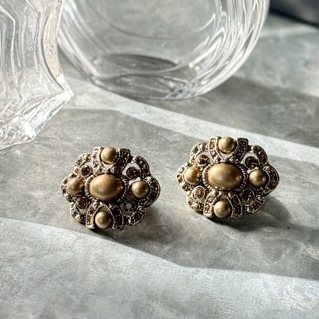 ゴールドトーンをベースに、中央にはマットな質感のゴールドパーツ、アンバーカラーのラインストーンが華やかに煌めくイヤリング。