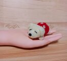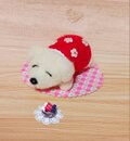 羊毛フェルト製の赤い服を着た白い犬のぬいぐるみ。