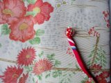 中綿を入れ、正絹の着物で作ったループを付け、ループの先に、トンボ玉と山サンゴを付けています。