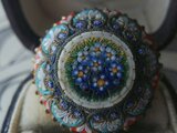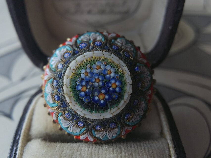 中央の勿忘草から、何重にも重なるマイクロモザイクと豊かなお色達。
