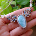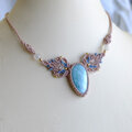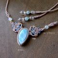 ライトブルーとホワイトが交じり合い水面のような優しい色合いが魅力的なラリマーをメインに2色のコードで繊細に編み込み首元を彩る女性らしいマクラメ編みアクセサリーに仕上げました。